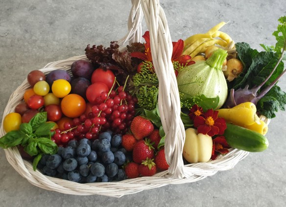 Juli. 40677 gram. Ja, att tomaterna till slut kom i gång denna kalla sommar syntes direkt på vikten! Potatis, rödbetor, fikon, kål, basilika, vinbär, hallon, tayberry… Vår trädgård är en frukt- och grönsaksaffär där vi inte saknar något. Den första bilden i inlägget på mig med skördekorg är tagen just i juli.