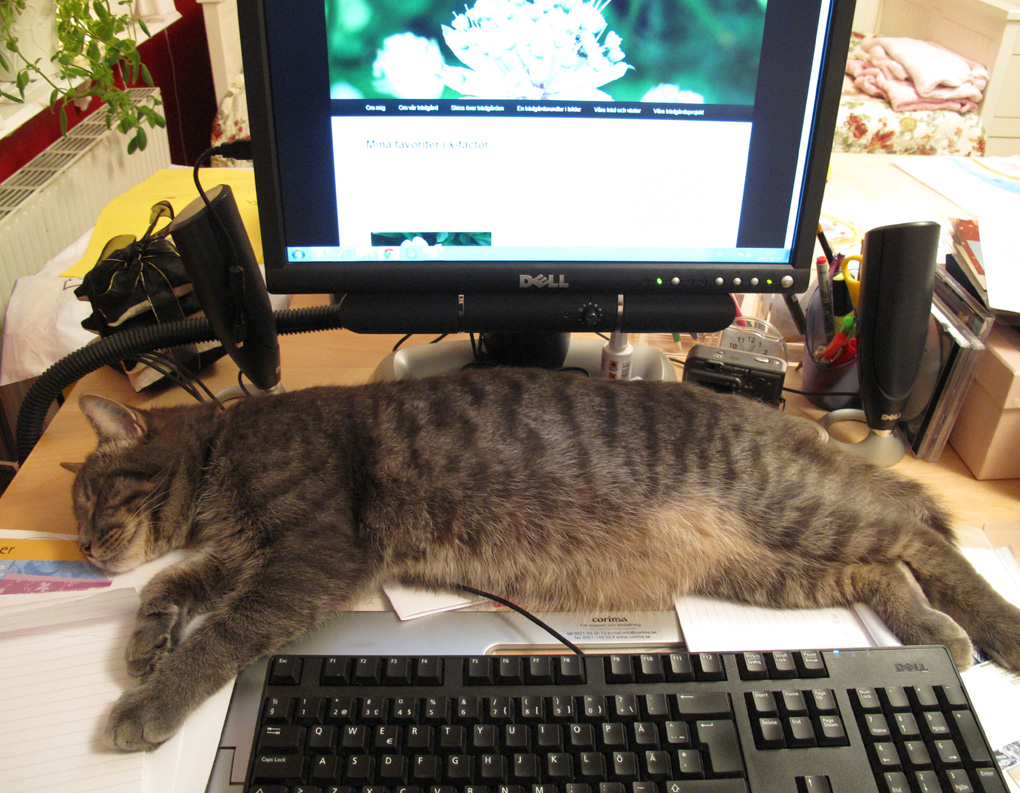 Ända sedan han var en liten, liten kattunge har S älskat att lägga sig mellan skärmen och tangentbordet… Numera är han en ståtlig kisse på nästan fem kilo muskler som gör processen kort med mössen i grannskapet (och tyvärr en och annan småfågel), men när han är inne är han hela familjens lilla goskatt.