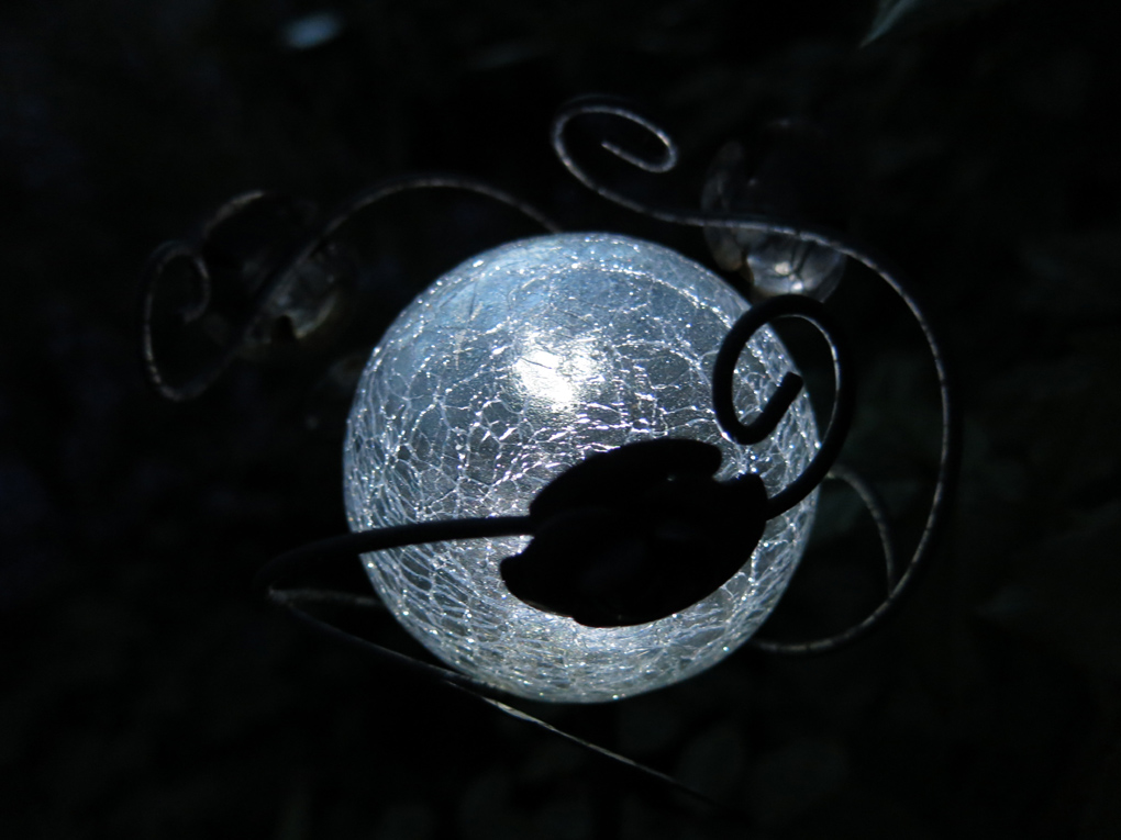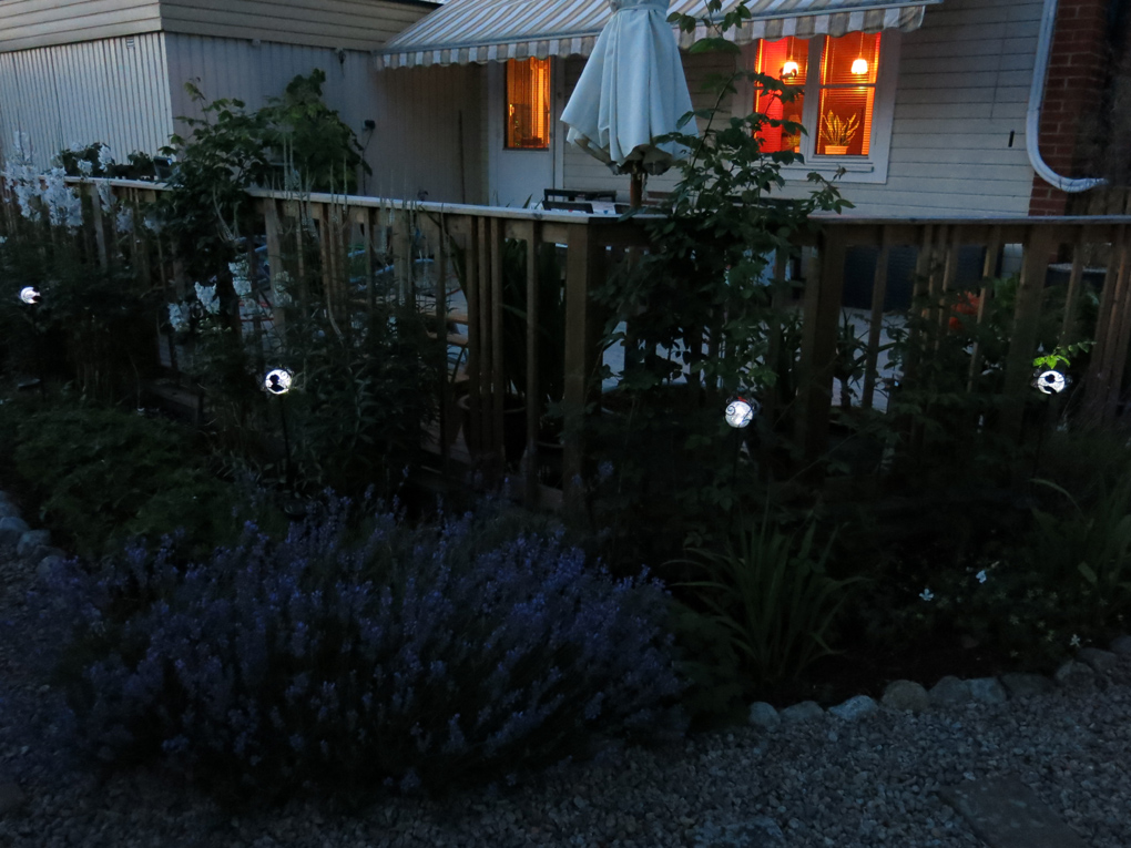 Det är skymning och solcellslamporna tänds i rabatten vid Stora trädäcket. Är så nöjd att jag hittade dessa fina ”glasklot” med en svart smidesslinga och en liten ros runt klotet. Har haft dem i två år nu och än så länge har de hållit.ljus solcellslampa 2 ljus solcellslampa