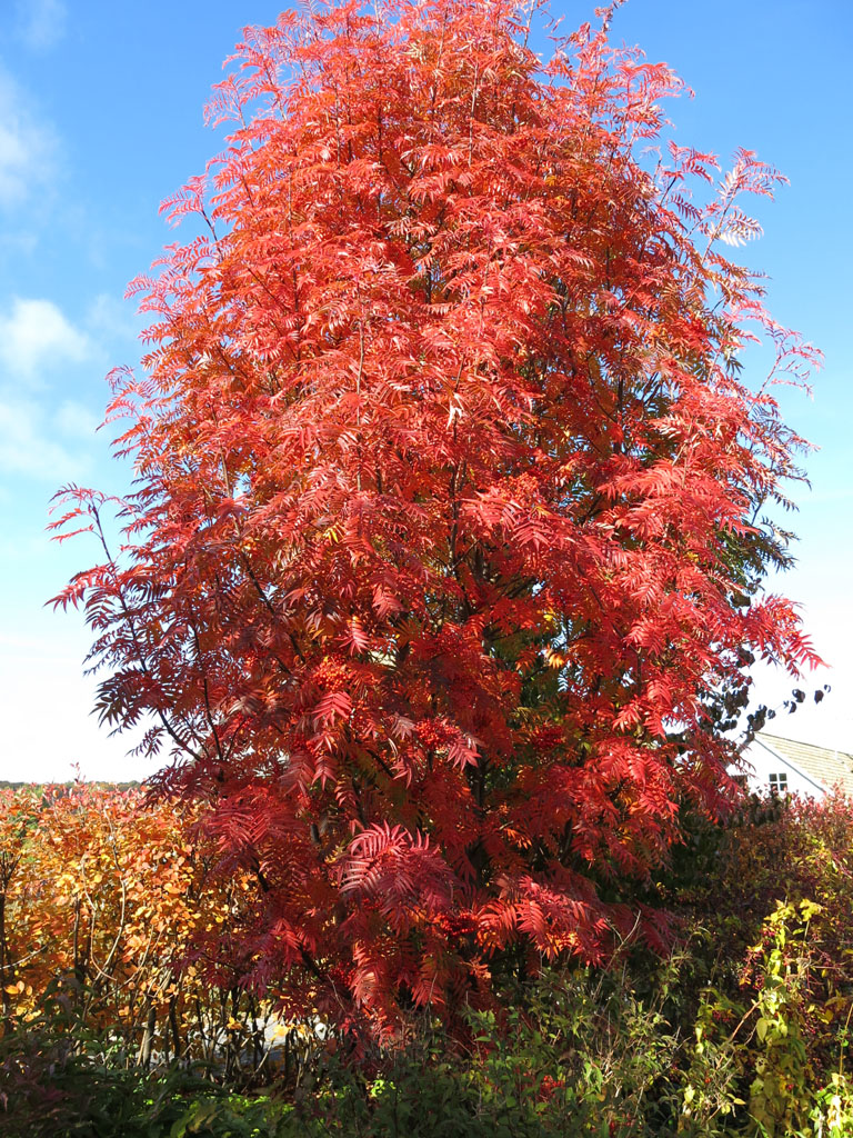 Tiden går fort när man har roligt, säger de. Och oj, vad roligt jag har haft! För ett år sedan hade frosten pudrat trädgården med glitter när jag skrev mitt allra första trevande inlägg. Det har frosten inte gjort i år. I stället glöder höstfärgerna i trädgården och intensivast av dem alla sprakar Ullungrönnen Sorbus ‘Dodong’.Ullungrönn sorbus dodong