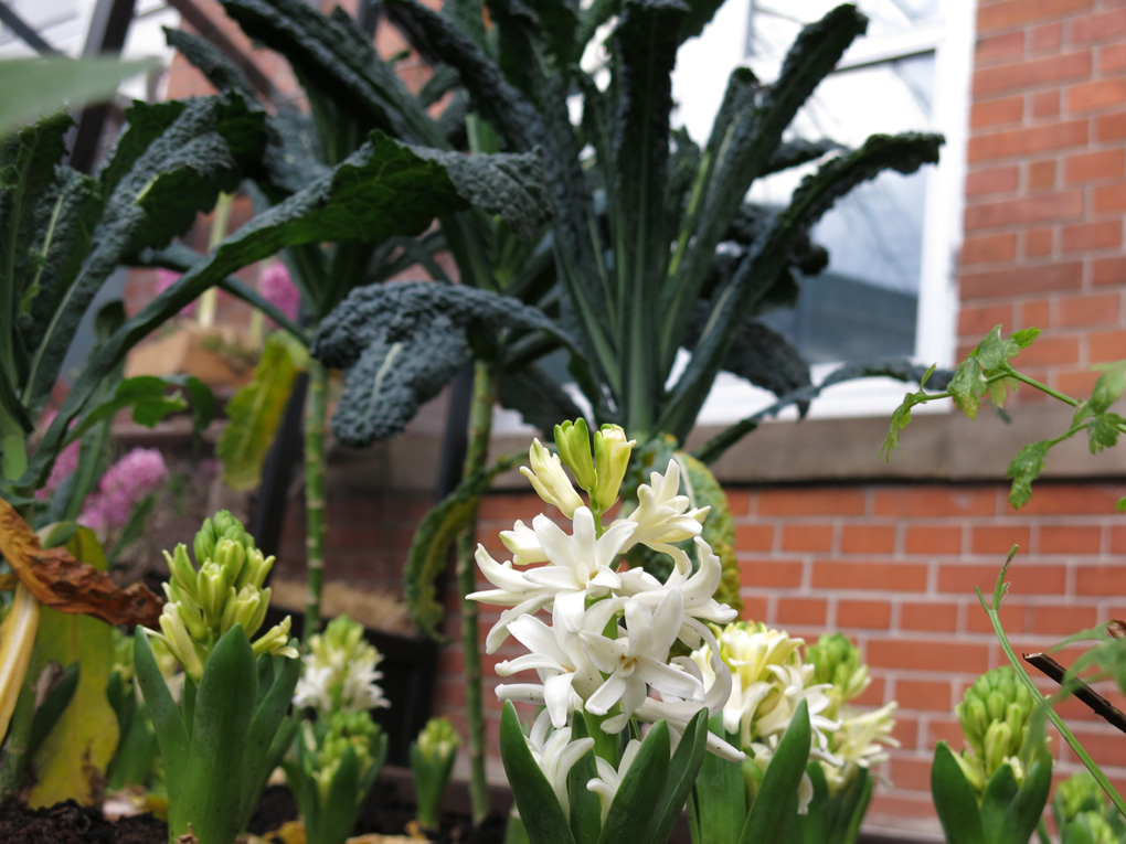 Man kan använda grönsaker som snygg komplettering till julblommor, se bara hur svartkål och fänkål håller de här hyacinterna sällskap:Tivoli julmarknad 8 Tivoli julmarknad 9