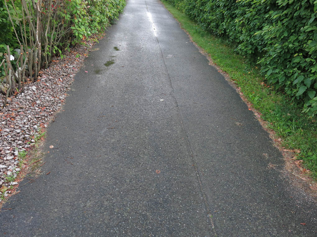 Använd material som sniglarna ogillar i din trädgård. Vi har en barriär på 30-40 cm ”krossgrus” vid tomtgränsen. Här på bilden nedan ser ni cykelvägen som går vid vår tomt, den är rena autostradan från åkern lite längre bort. Krossgrus till vänster (under den nerklippta häggmispelhäcken) och grönt fuktigt gräs till höger hos grannen… Vilket håll tror ni sniglarna väljer att krypa?