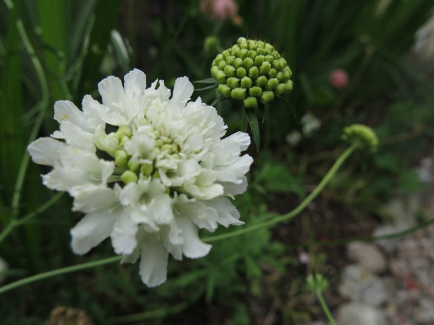 Det är en ettårig vädd som heter ‘Snow Maiden’. Blomman är något större än grekväddens. Den brukar självså sig lite, men då blommar den senare än om jag sår den inne på våren.