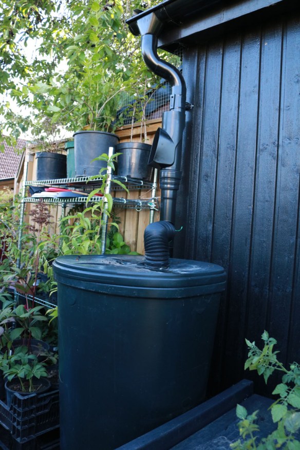 Det blir alltså snabbt stora mängder att fånga upp och använda i stället för kranvatten. Även ett litet tak, säg på vårt nya fågelhus, ger många liter vatten varje gång det regnar. Numera fyller regnet vattentunnan i komposthörnan, men en sådan här torr sommar fungerar det självklart inte hundraprocentigt. Då får vattenslangen hjälpa till att fylla upp tunnans 300 liter. Sedan har jag vatten till växterna som står på vänt att planteras ut på rätt plats samt trädgårdslandet precis bredvid. En extra bonus är ju att vattnet dessutom inte är iskallt. Det lättaste är att montera en fällbar utkastare som vintertid bara fälls upp på stupröret så vattnet åter kan rinna till dagvattenbrunn/stenkista. Utkastaren på bilden finns bakom den böjbara slangen. Ovanför har vi satt en renstratt så inte bigarråer och löv hamnar i tunnan.