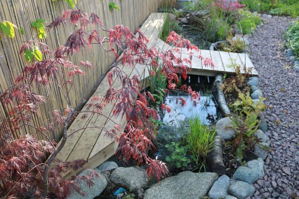 På motsatta sidan dammen breder Acer japonicum ‘Inaba-shidare’ ut sina vackra blad över djuphålan på dammen.