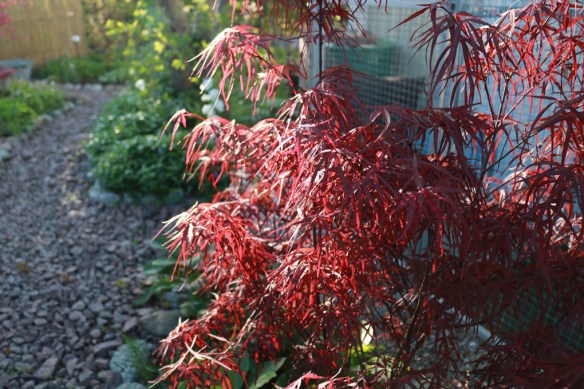 På andra sidan gången håller Acer palmatum ‘Seiryu’ på att växa till sig. Röda stammar och limegröna blad – så vackert! Ser fram emot när den blir större.