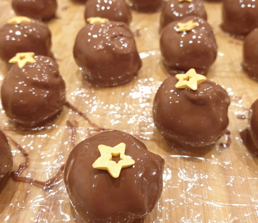 Saffranstryffel doppad i vit choklad och rullad i sockerrostade mandelspån