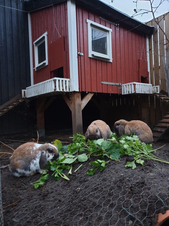 Våra tre kaniner bryr sig inte om vädret men blir extra glada för lite grönt från trädgården. Än finns det blad på björnbären, persilja och lite örter att ge dem som komplement till höet som de ska ha till allra största delen.