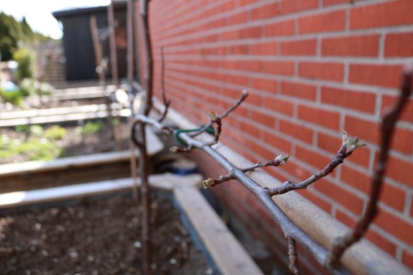 I bakkant på våra upphöjda odlingsbäddar för grönsaker, närmast den skyddande och värmande tegelväggen, växer spaljérade äppelträd. De har inte så stor rotklump, utan har ännu så länge trivts bra på denna plats. Under sommaren har de ett lager med fårull på den nakna jorden som hjälper till att hålla kvar fukten och skyddar rötterna från stekande sol.