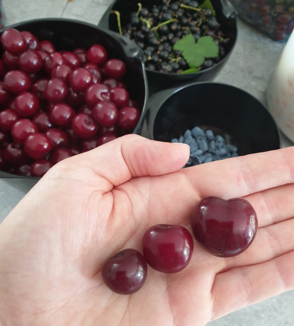 Skillnad på bär och bär… Det här är tre av våra körsbärssorter. Från vänster till höger: buskkörsbäret ‘Lettisk låg’, surkörsbäret ‘Fanal’ och bigarrån ‘Stella’. I bakgrunden på bilden syns mer av Fanal, svarta vinbär och bärtry.
