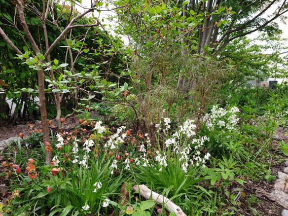 Å andra sidan har du ruggar av spansk klockhyacint, jag har enstaka spret (det är väl för torrt, som vanligt). Ditt snödroppsträd är ljuvligt att se, en ny växt för mig. Ska googla lite. Men så har du grävt bort en av mina favoriter – vitlysingen! Tur att du sparade lite i en kruka i alla fall!