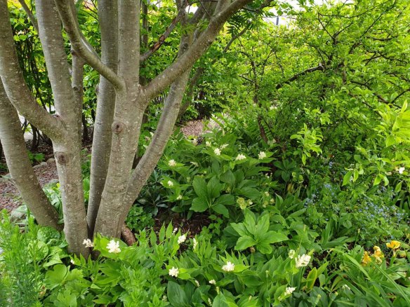Under Ullungrönnen ‘Dodong’ är det lummigt grönt av överblommade julrosor, vitblommande vipprams, blåblommande kaukasisk förgätmigej och annat.