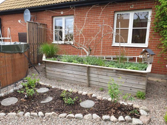 I Solrabatten skulle ju blåregnet ha blommat, men majoriteten av blommorna frös. Men otroligt nog klarade sig några få knoppar som är närmast husväggen! Den lilla trekantiga rabatten framför innehöll förr ett hav av vitlysning, men när jag behövde plats för mina tre nya bärtrybuskar (och en hortensia) så fick de försvinna. Lite av vitlysingen har jag sparat i en stor kruka, för fjärilarnas skull. Bärtrybuskarna ska med tiden bli 100-150 cm höga. Den största av de tre buskarna orkade till och med ge några få bär redan förra året när de ännu bodde i kruka!