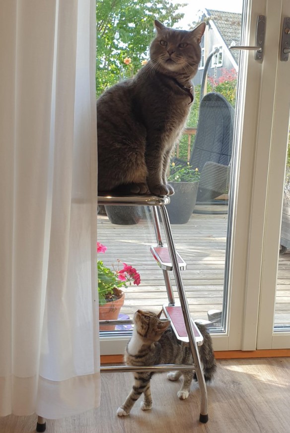 Det är ju lite skillnad på katterna i storlek. Izumi vägde 25 % av Silver när hon kom till oss. Silver, som vi tycker är världens bästa katt, är så snäll. Lite avvaktande bara. Men han verkar så här långt ha tagit nykomlingen bra, han beter sig som vanligt och vi är noga med att ge honom minst lika mycket uppmärksamhet som förut.