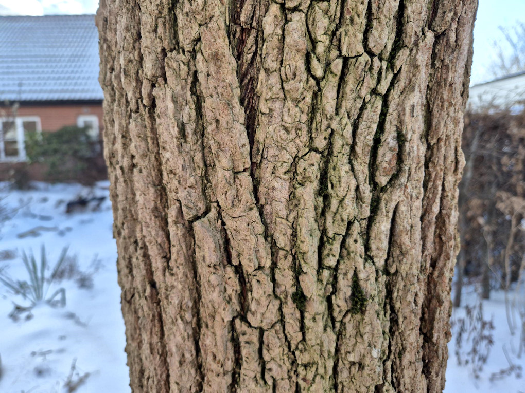 Klotrobinian, Robinia pseudoacacia ‘Umbraculifera’, har en stam som är otroligt vacker, den är så djupt veckad. Gissa om vår katt Silver älskar att både klättra uppför stammen och vässa klorna på den!