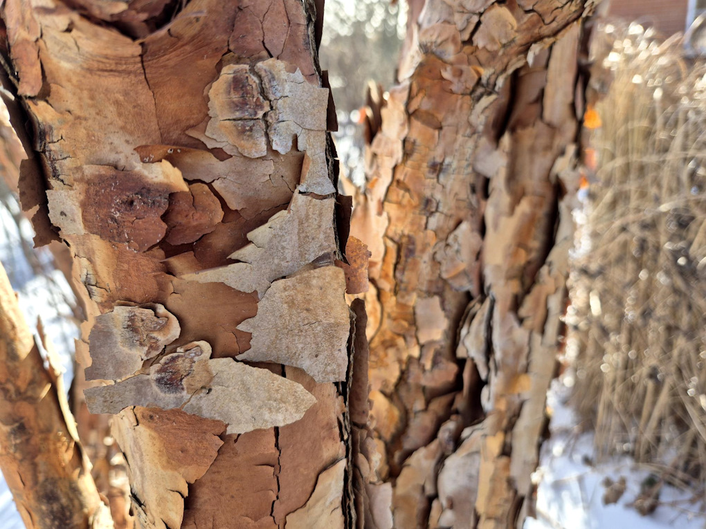 Vackrast vinterstam har nog ändå kopparlönnen, Acer griseum, med sin kanelbruna flagande bark! Det här trädet vill jag inte heller vara utan i trädgården.