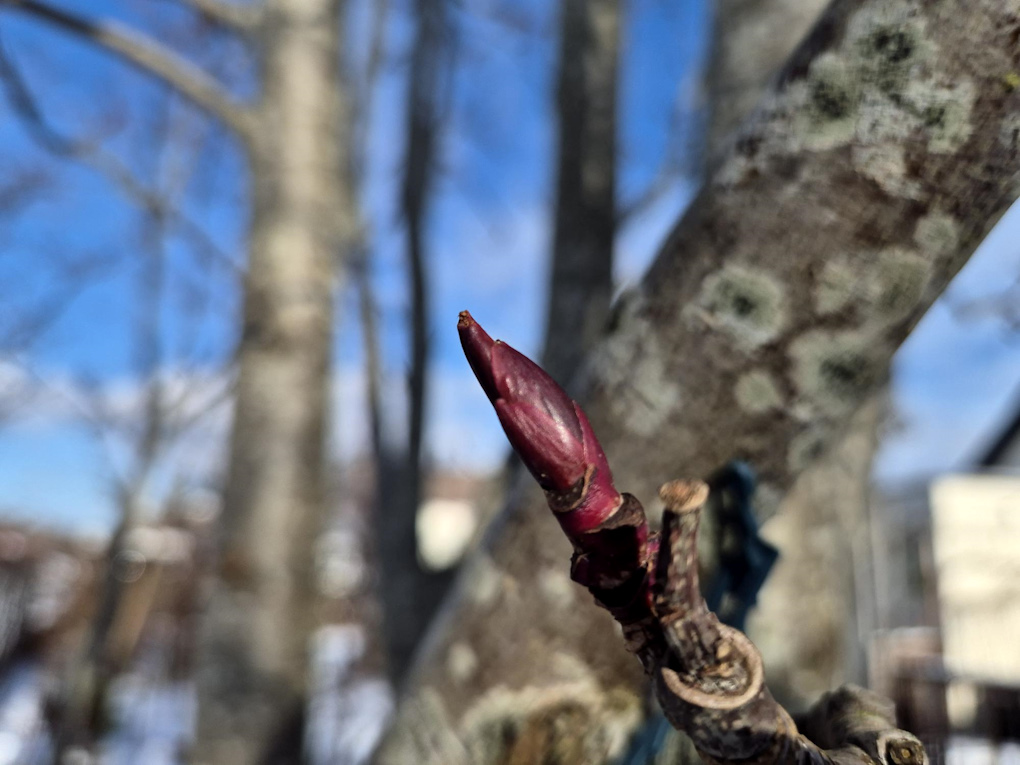 Jag är speciellt glad för alla träd med vackra stammar. Ullungrönnen, Sorbus ulleungensis ‘Dodong’ är vackert melerad med grå fläckar och de nya bladknopparna lyser i violett. Det här trädet är verkligen mitt favoritträd, under alla årstider.