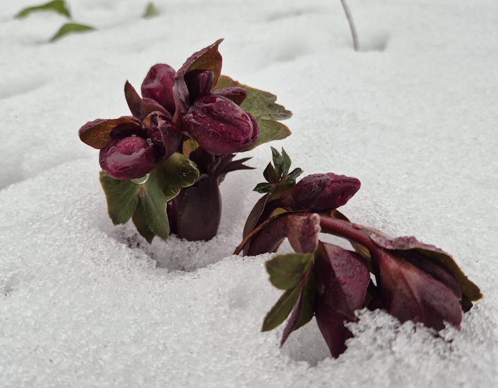 Julrosen ‘Ice Rose’ började blomma redan i januari, men blev sedan begravd under snön i en månad. Efter en dags töväder sträckte den åter sina blommor upp mot ljuset, genom blötsnön. Växter är fantastiska!