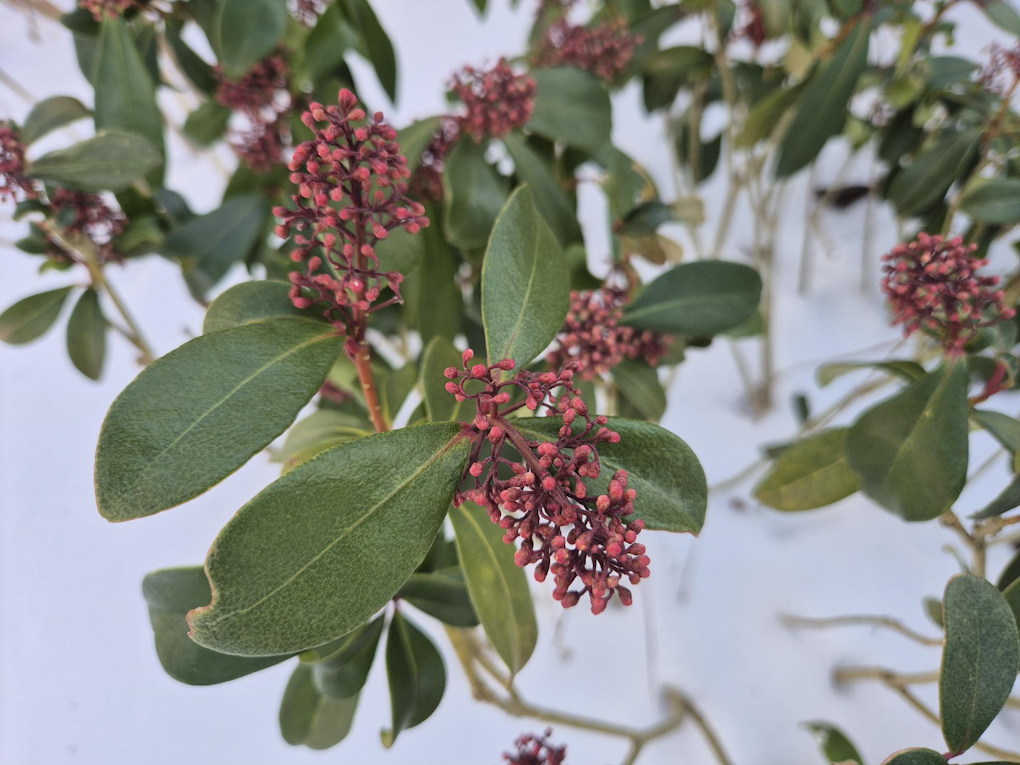 Det här vinterbäret, Skimmia japonica, är cirka tio år nu och är så fin med sina mörka blad och röda blomknoppar. Har du köpt den som säsongsväxt, så testa att plantera ut den. Skimmia klarar landets lägre zoner.
