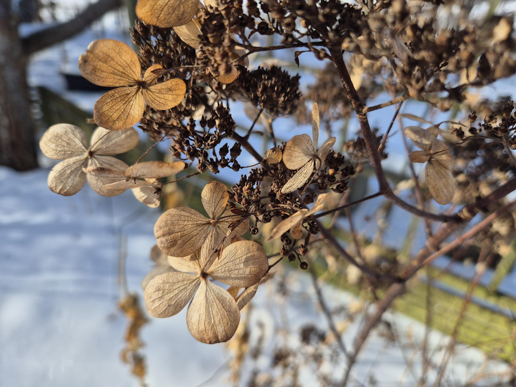 Hortensior av alla sorter är ofta väldigt snygga på vintern, speciellt om de placeras så den lågt stående solen lyser på de vissna blommorna. Här är det Hydrangea paniculata ‘Quickfire’.