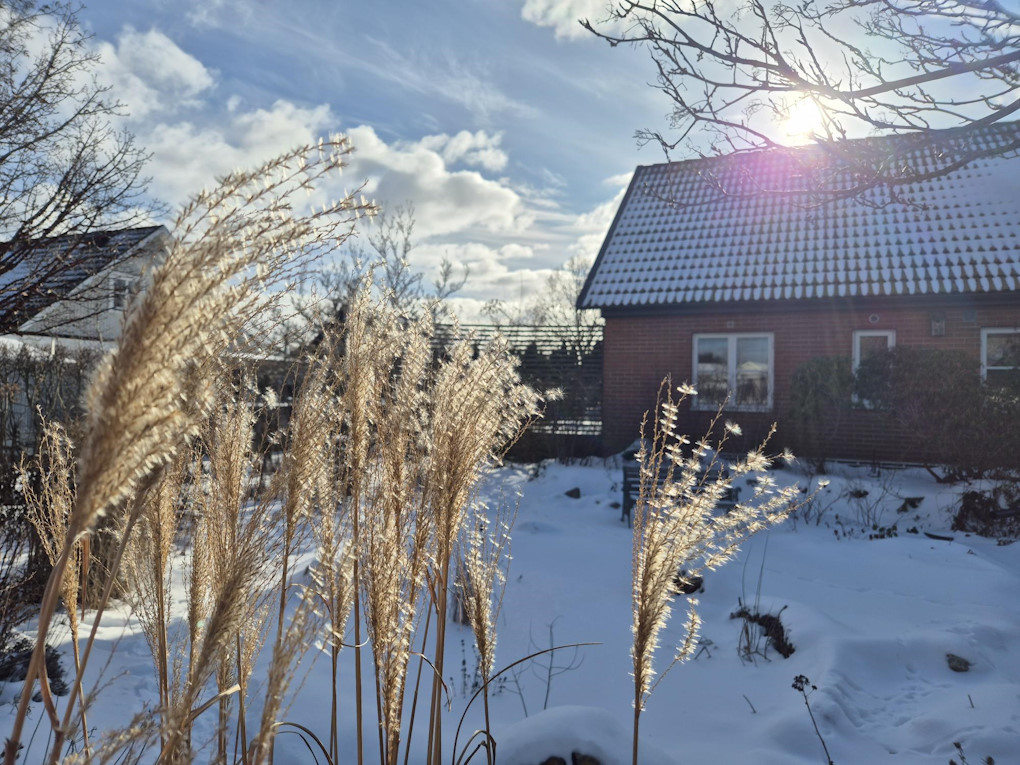 Fjolårsvisset kan också vara vackert, både vipporna på prydnadsgräs och fröställningar. Här är det Miscanthus som lyser i vintersolen.