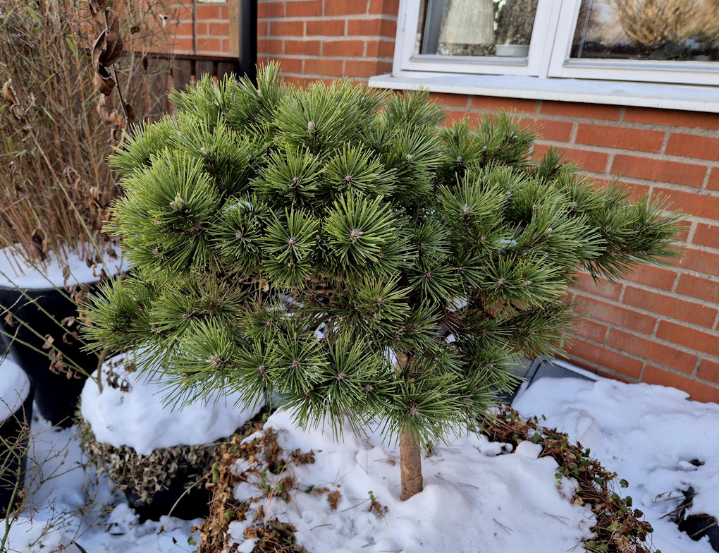 En liten tall i kruka vid ingången är grön och fin i snön.