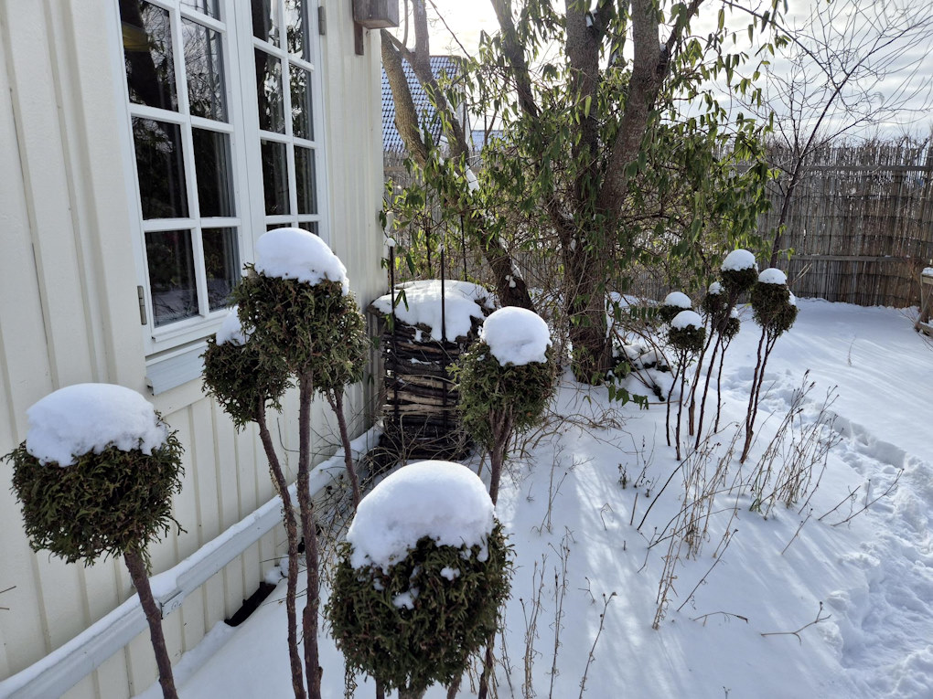 Sedan finns det ju det som är vintergrönt (tappar bladen på våren och får nya blad) eller städsegrönt (grönt hela året) i trädgården också. Vi har valt att klippa bollar på både idegran och tuja och det blir så fint när snön (eller frosten) lägger sig på dem vintertid.