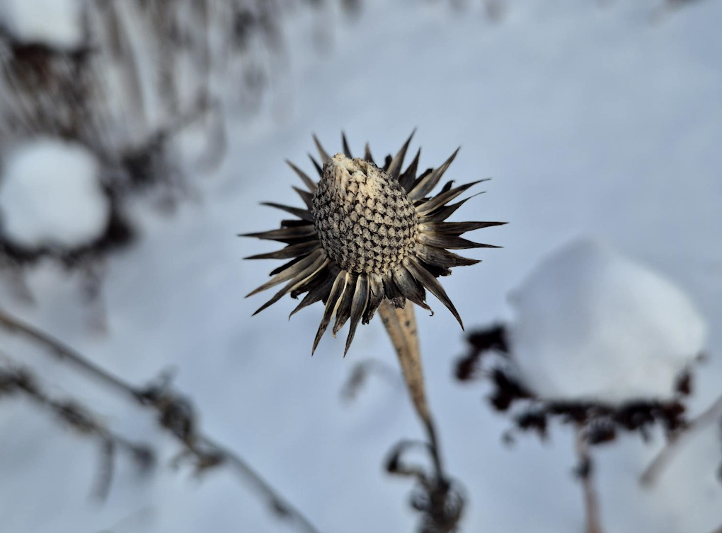 Även fröställningar kan vara vackra, här en solhatt som småfåglarna har ätit ren på frön.