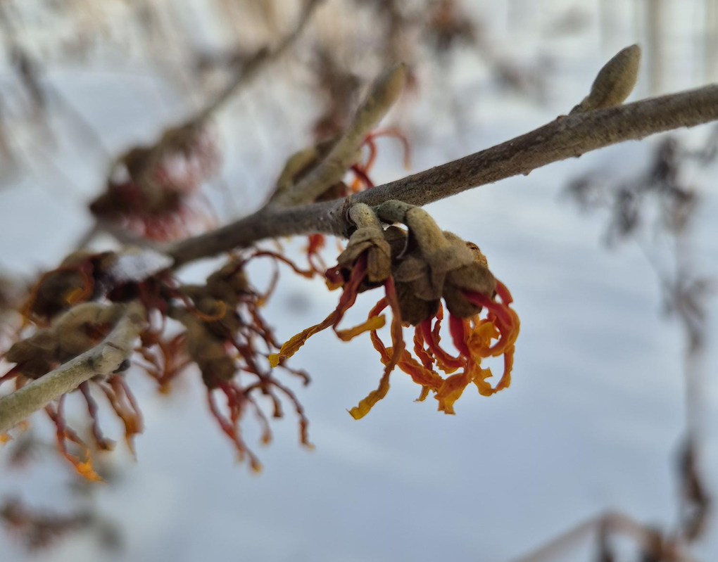 Tidigblommande buskar och lökväxter är själva desserten i vinterträdgården. Trollhassel, Hamamelis x intermedia ‘Jelena’ har blommat sedan före jul och fortsätter trots kyla.
