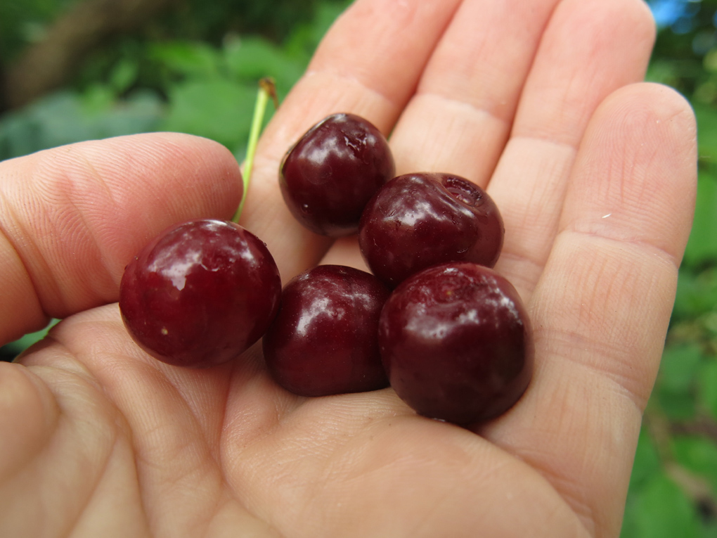 Körsbär. Har surkörsbäret ‘Fanal’ och buskkörsbäret ‘Lettisk Låg’, båda ger en stadig skörd de flesta år.