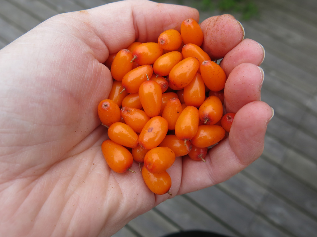 Havtorn. ‘Svenne’ och ‘Lotta’ var en del av vår trädgård under en handfull år, men togs sedan bort och fick flytta till en annan trädgård. Goda bär, men såå svårskördade. Bären spricker lätt när de plockas och knepet att frysa en gren och slå av bären tyckte jag inte fungerade – hur skulle smutsen på bären tas bort? Att de skickar rotskott var också en faktor till att jag gav upp dem.