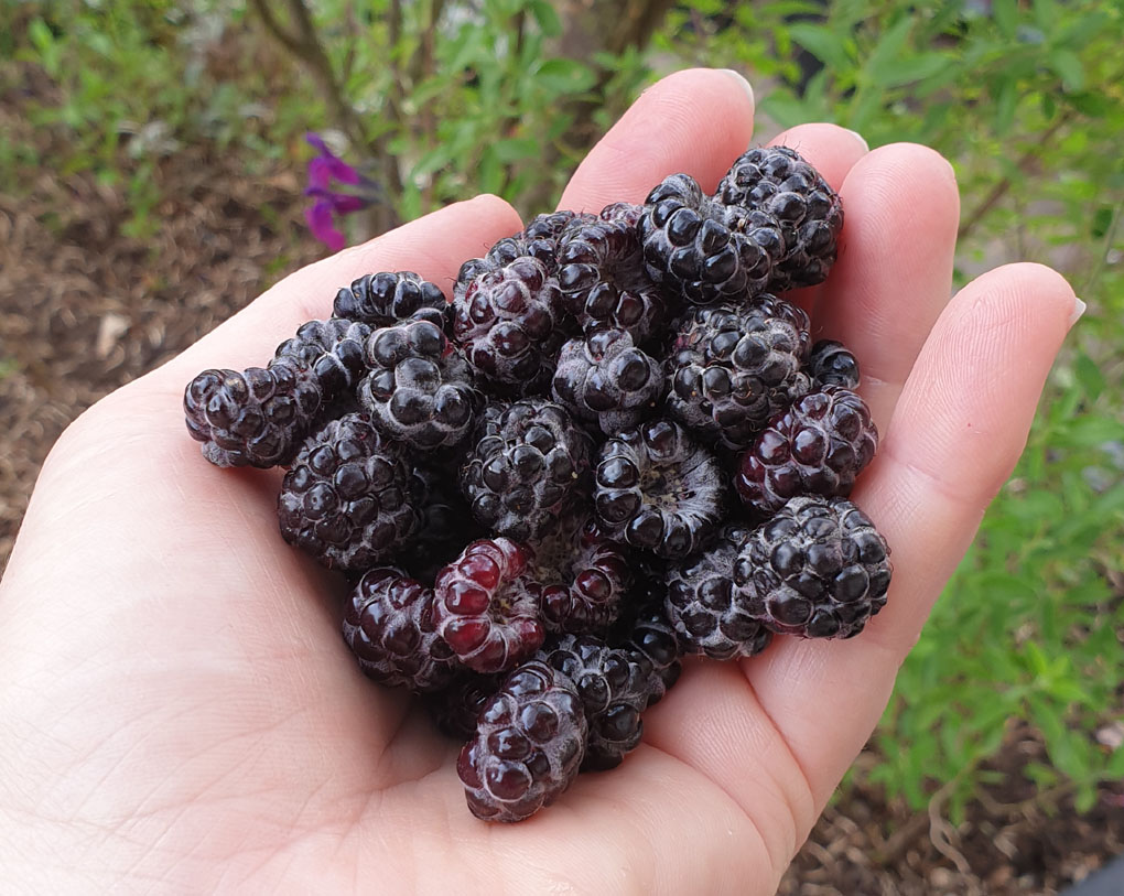 Björnbär ‘Black Satin’ och tayberry ‘Buckingham’ och ‘Thornless’.