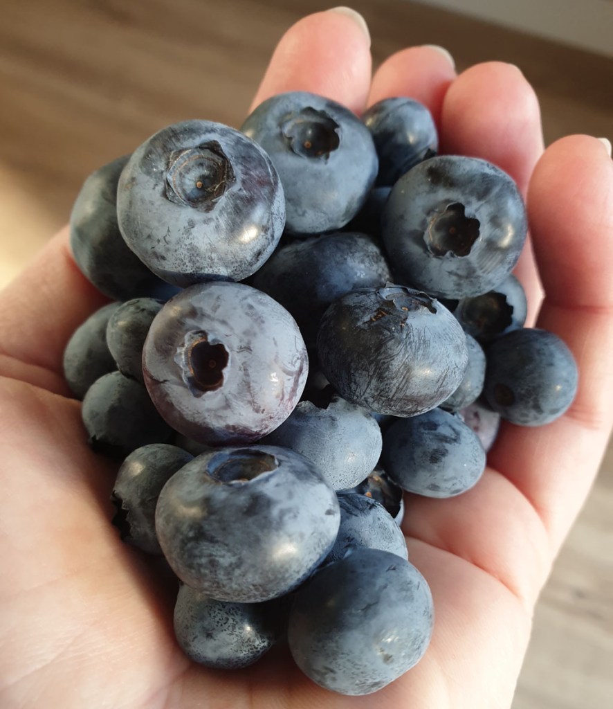 Amerikanska blåbär. Vi planterade en handfull buskar av olika sorter (namnlapparna finns tyvärr inte kvar) 2001 och buskarna ger mycket bär alla år. De är planterade i grov torv som håller fukten bra och gör att buskarna även torra somrar ger bra med bär. Det har också dykt upp fröplantor som fått vara kvar om bären har varit i bra storlek och smak. Det behövs oftast minst två sorter för korspollinering. Våra ger bär från juli till senhösten. De sista är inte så söta men blir till god saft.
