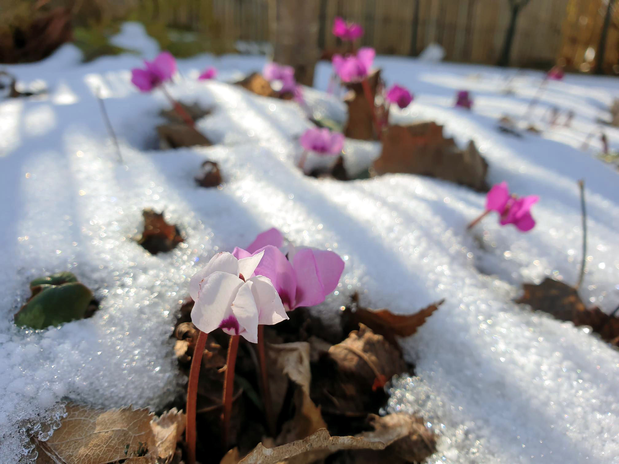 I trädgården kämpar vårblommorna på. Ena dagen barmark och plus 10 grader, nästa lika många minus och snö… Följ med på en rundtur. 🙂