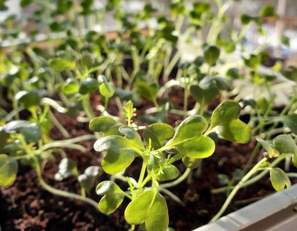 Inomhus i köket växer microblad och skott (även de i kokosjord) och groddar. Favoriten är klassikern alfa alfa och ärtskott. Här på bilden är det mizuna som snart är skördeklar. Tänk att något så enkelt kan vara så gott!