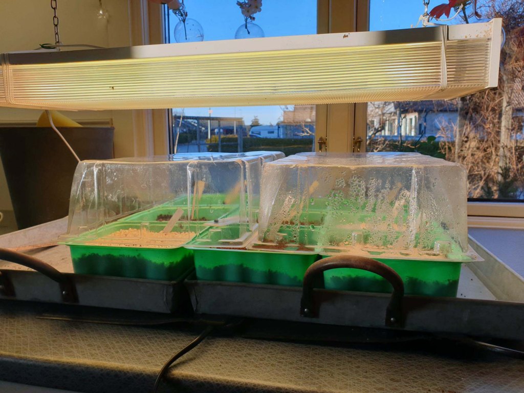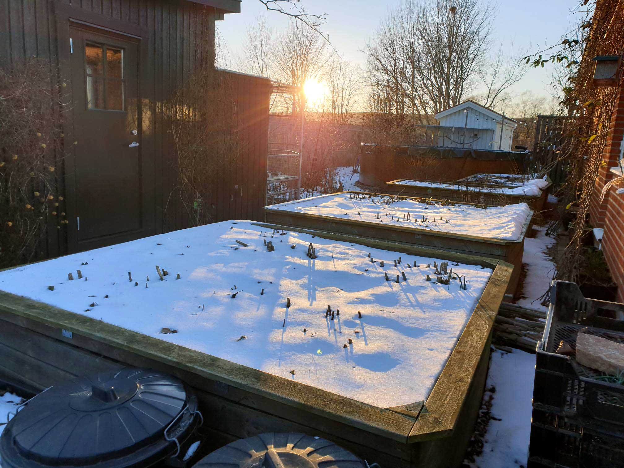 Det är andra veckan i mars och sedan en vecka ligger åter snö och is över trädgården. Vårfixandet har avstannat, men i trädgårdsboden gror tomaterna och de andra innesådderna och växer sig stora och starka under lysrörets ljus.