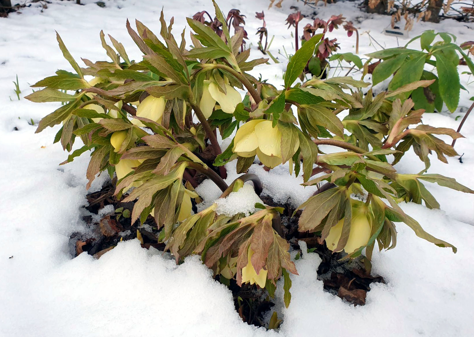 Den gula julrosen är alltid tidig och tålig. Böjer ner sina klockor lite, det är allt.