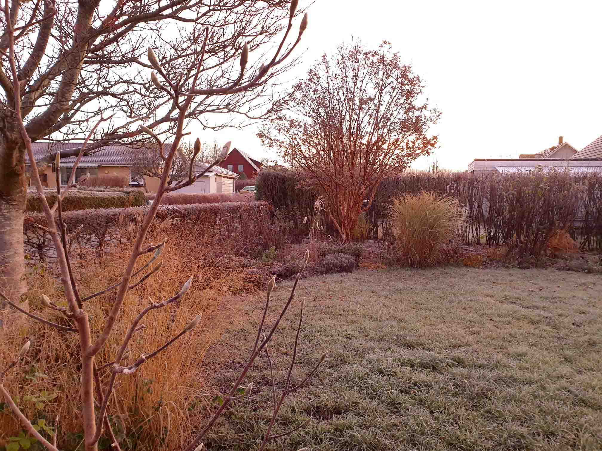22 november och frosten sprejar vita gnistrande kristaller över hela trädgården. Själv gläds jag åt det som komma ska: se bara så många blomknoppar trädet till vänster har! Det är magnolian ‘Honey Tulip’.