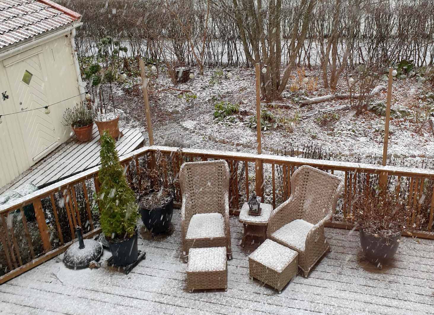I dag den 24 november föll den första snön. Den försvann förstås nästan med en gång, vi bor ju trots allt i zon 1 Skåne, men det var vackert så länge det varade.