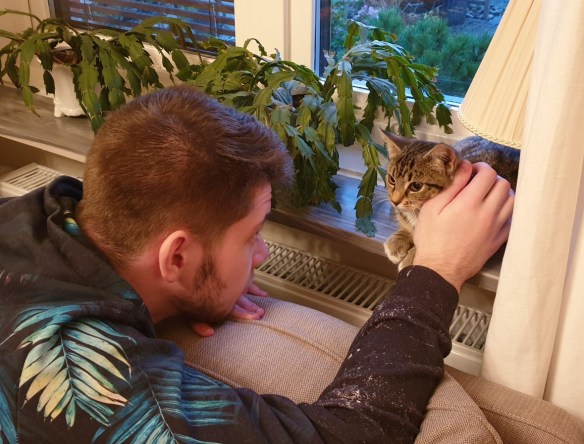 Så här ser trädet ut. Det är ungefär två meter högt nu och skuggar en del av våra fågelvoljärer. I bakgrunden syns aronia ‘Vikings’ svarta bär.