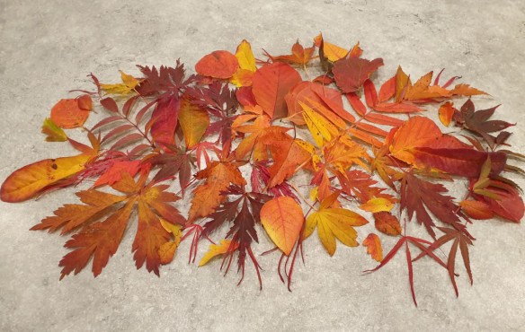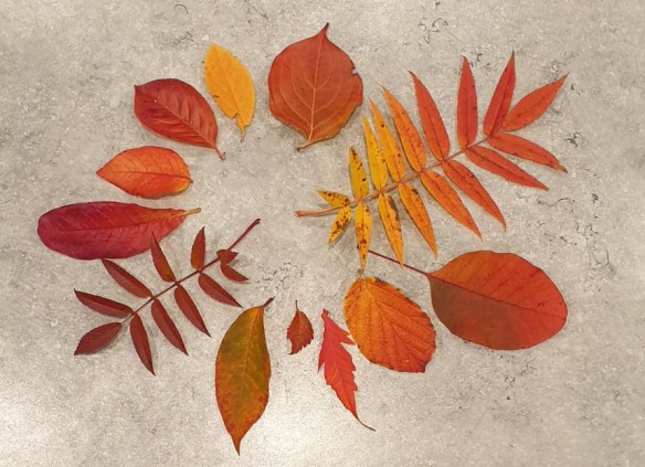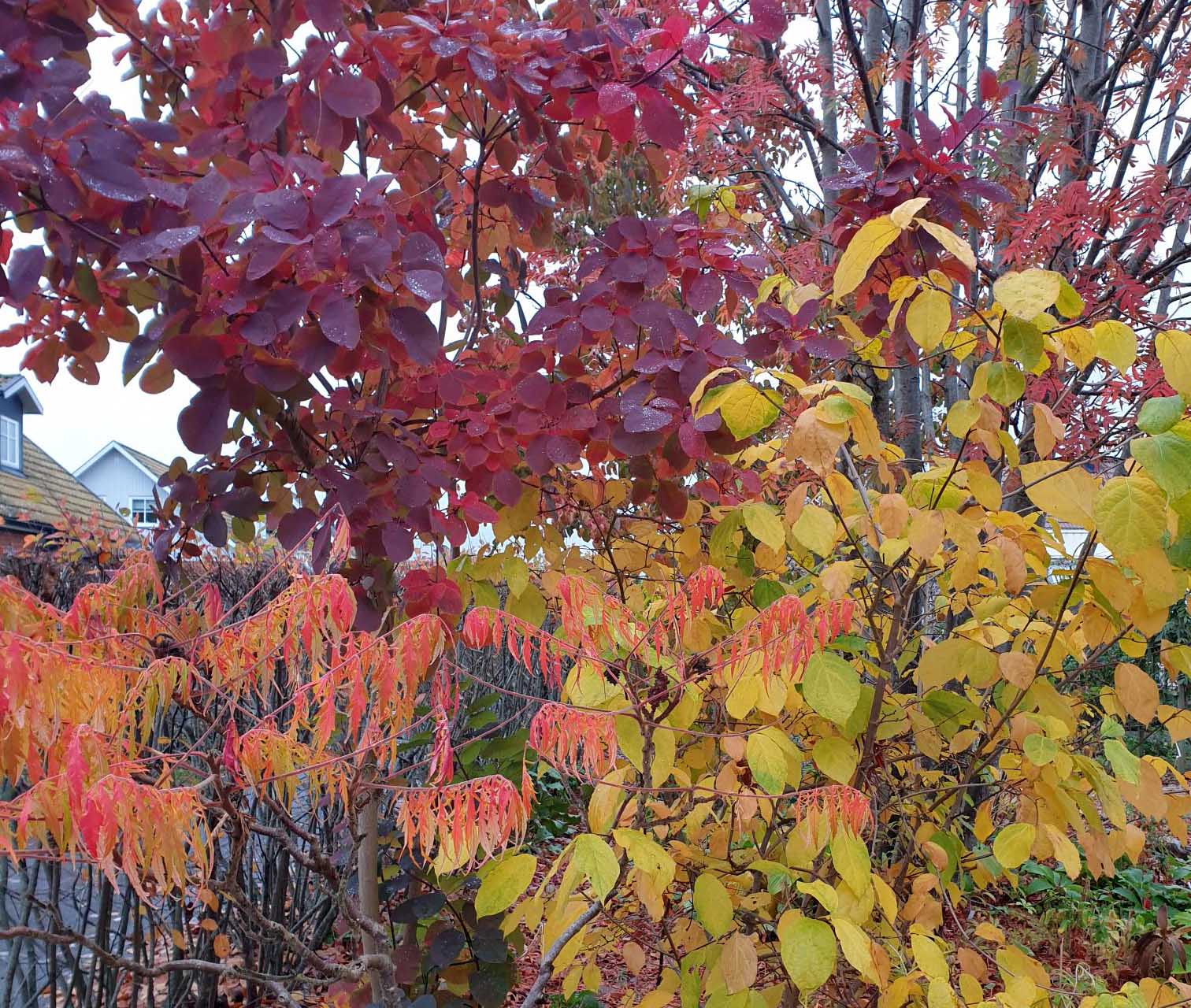 En favoritkombination hösttid i lundområdet är de orange bladen hos rönnsumak, Rhus typhina ‘Tiger Eyes’, de smörgula bladen hos trädgårdskryddbuske, Calycanthus raulstonii ‘Hartlage Wine’, och de mörkt röda bladen hos perukbuske, Cotinus coggygria. Disiga dagar ser det ur så här: