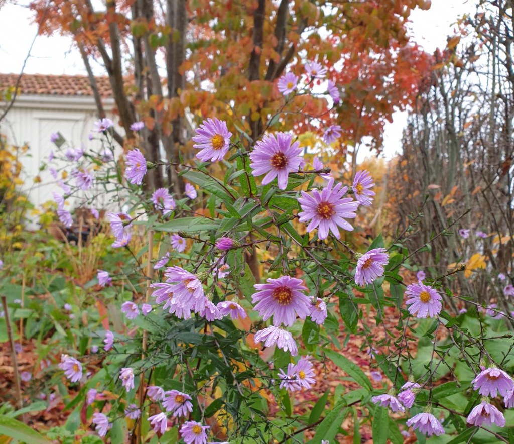 Här kommer ett tips: plantera fler höstastrar i din trädgård. Tåliga och blommar länge. Är det en varm höst ger de pollinatörerna mat också. Det jag tycker är snyggt med sorten ‘Calliope’ är de mörka stjälkarna och den bronsröda mitten som matchar höstlöven. Hela astern är som ett skirt moln av små violetta blommor.