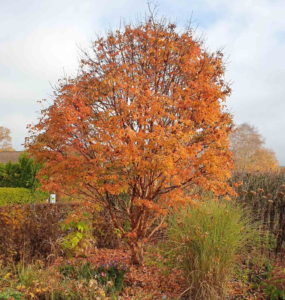 Vår kopparlönn, Acer griseum, är nu drygt fyra meter hög efter 21 år. Detta träd växer mycket långsamt (i snitt 10 cm per år) och är väl värd att lägga lite mer pengar på för att få en rejäl storlek. Planteras gärna där vintersolen lyser på stammen. Vårt exemplar har mycket vacker grenuppbyggnad och flagande bark men får tyvärr inte knallröd färg, utan ”bara” orange. Prydnadsgräset som syns till höger om trädet är en glansmiskantus Miscanthus sinensis ‘Morning Light’.