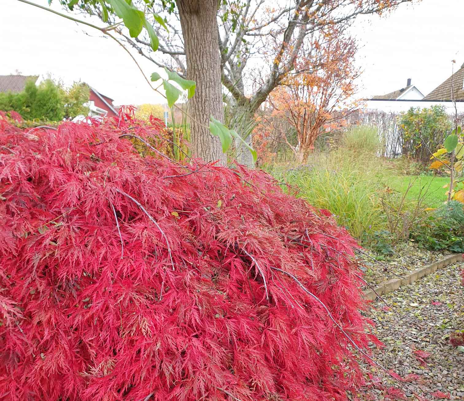 Den allra rödaste av våra olika japanska lönnar är den 21 år gamla ‘Inaba Shidare’. Under den välvda kronan som numera är över en meter i diameter brukar våra katter krypa in sommartid och lägga sig i skuggan, helt dolda för omvärlden. Varje vår lägger jag in lite torra löv som ger dem en mjuk bädd.
