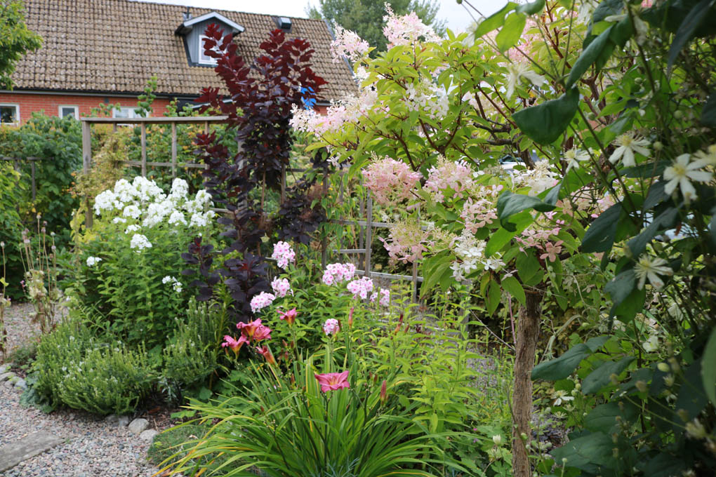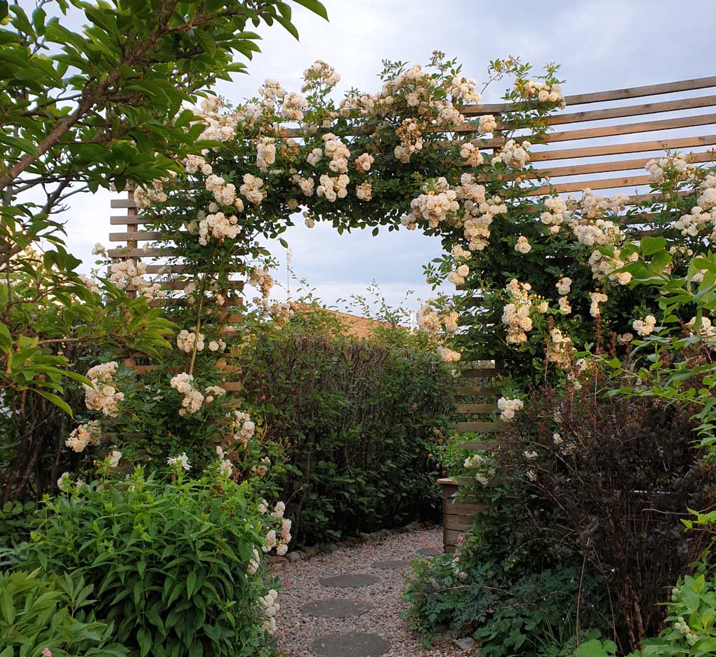 Det blir också Törnrosas kjortel och fackelranka ‘Fresco Rose’ på några ställen där jag har behov av en klättrare.