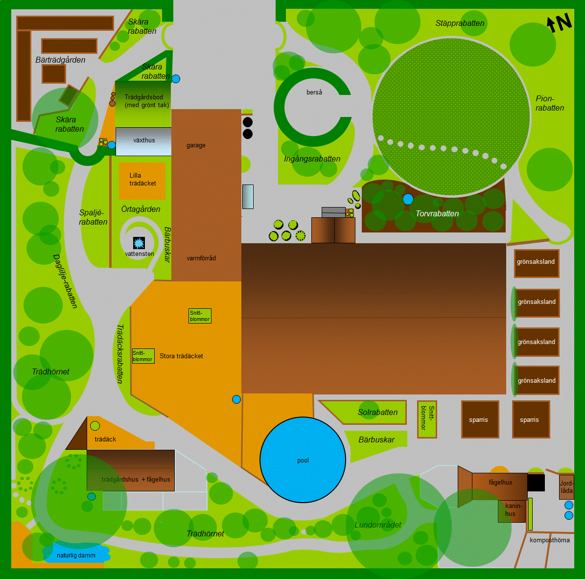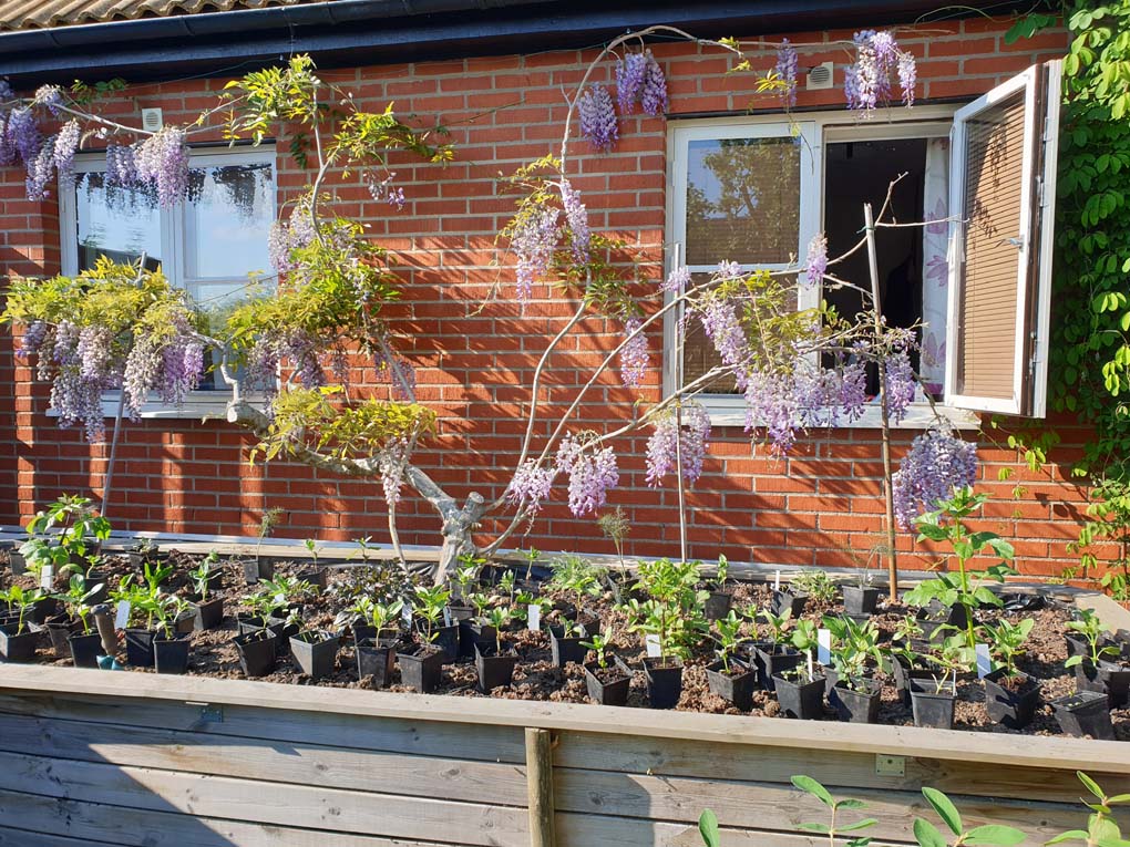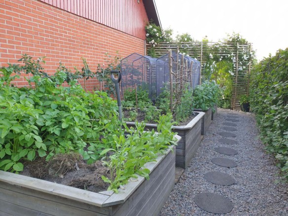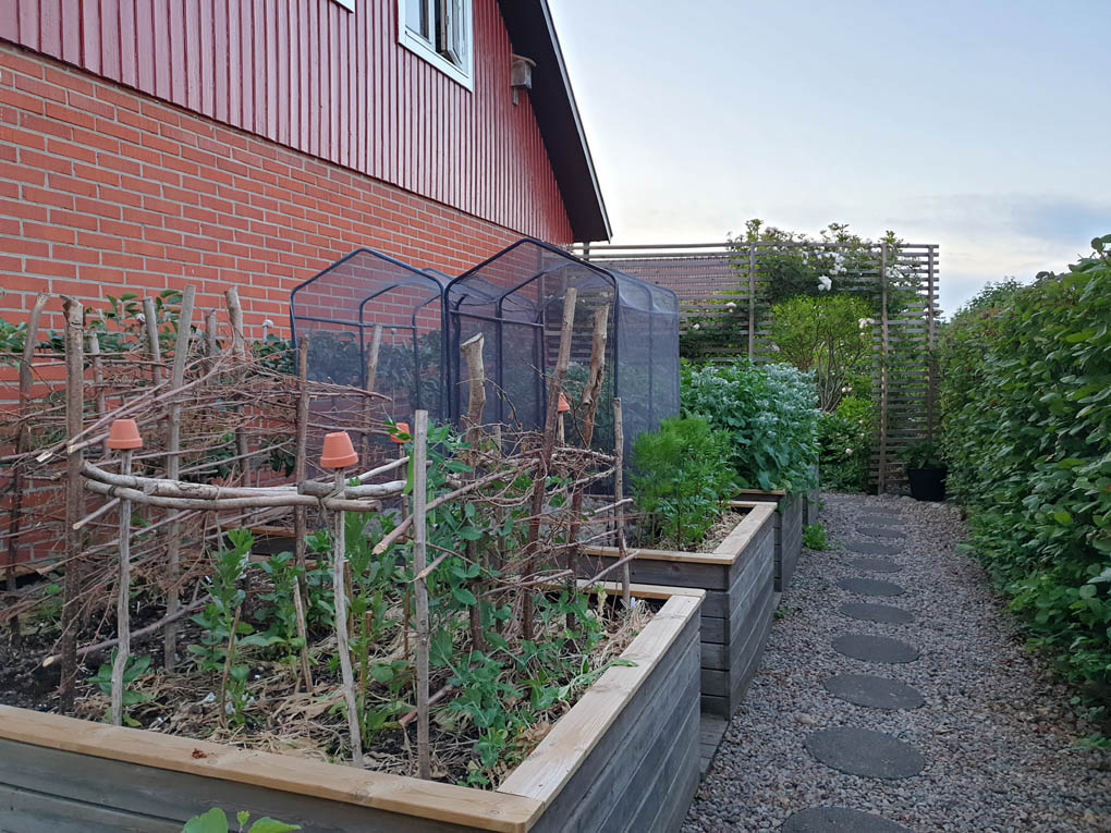På husets östersida, i de fyra upphöjda odlingsbäddarna (som vardera är på fyra kvadrat) blir det: