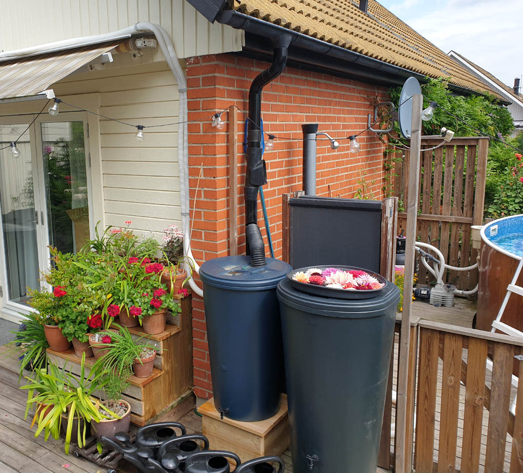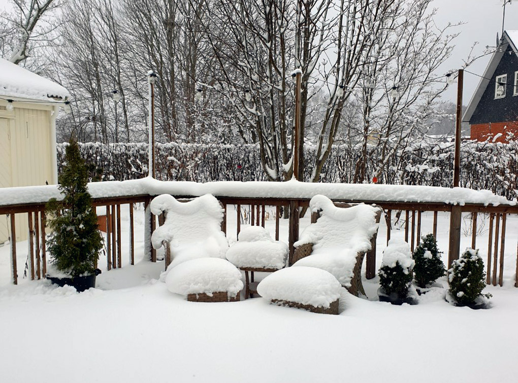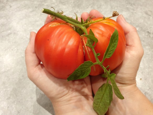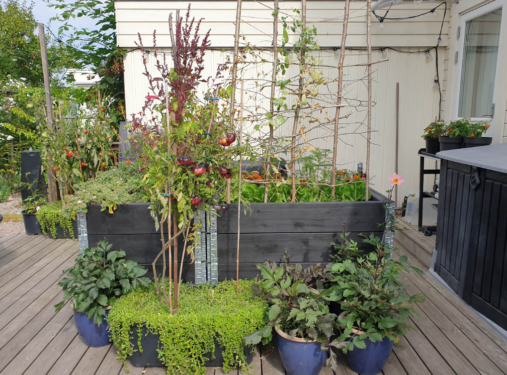 På stora trädäcket blir det förstås också en massa tomater i stora murbruksbaljor. Dock inte fullt så många som 2024 när vi skördade inte mindre än 60 kilo tomater! Frysen är full med tomatsås och den lär räcka under 2025 också. Därför satsar jag på mina favoriter och färre i antal. Det ger ju å andra sidan möjligheten att odla annat.