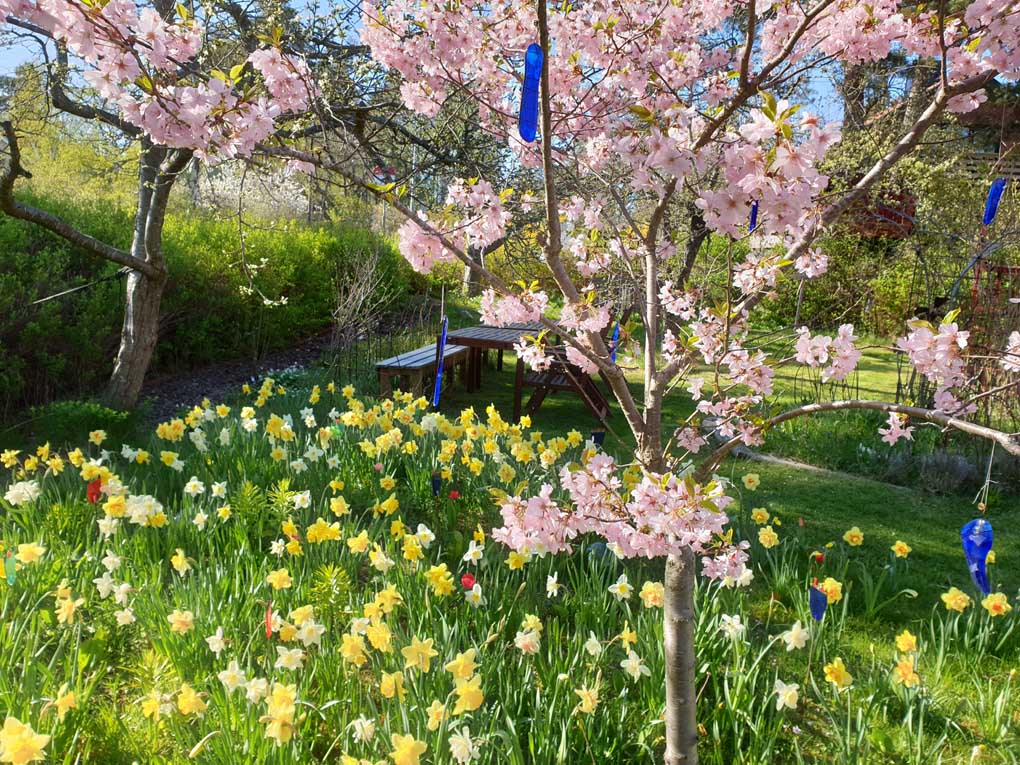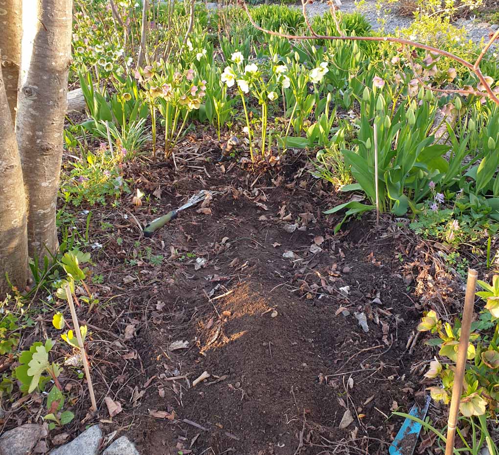 I den minsta upphöjda bädden på två kvadrat i söderläge får i år tre plantor av physalis samsas med potatisöken. I områdena mellan physalisen blir det Linnétagetes och morot ‘Golden Nuggets’. Jag räknar kallt med att ha hunnit skörda löken innan physalisen brer ut sig och detta är det land där morötterna skördas först. 2024 trodde jag inte det skulle bli någon vidare physalisskörd, de var så sena att mogna. Men i slutänden blev det 1,5 kilo mogna bär på två plantor! Och ett normalstort bär väger tre gram… Så 2025 så vill vi ha fler bär! Men plantorna är törstiga på både vatten och näring, så jag tänker att samplantering med lök borde kunna bli bra.