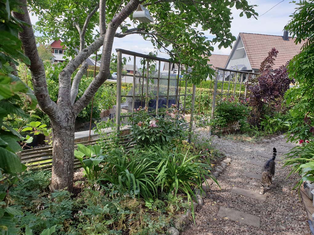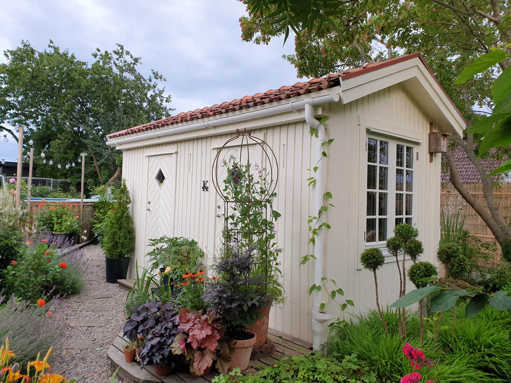 Utanför trädgårdsrummet, barnens före detta lekstuga, har jag en stor kruka med klätterställning i. Där trivs störböna ‘Neckargold’ och den får i år sällskap med sockerärt ‘Lokförare Bergfälts jätteärt’ (sådda senare än de som samodlas med tomaterna).