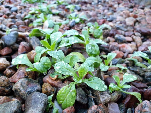 Nedanför de upphöjda bäddarna växer också mâchen som rena ogräset i grusgången under vintermånaderna. Det är jättebra, för där blir den inte så jordig när det regnar vintertid. Godaste ogräset brukar jag säga!